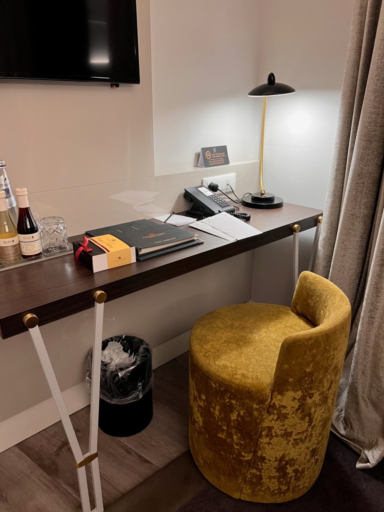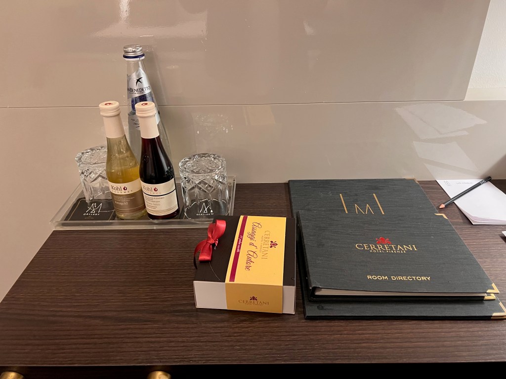 Despite having over 500 channels showing on the 40″ LED TV mounted on the wall across from the bed, there are limited English entertainment options as most of the channels on the TV are Italian channels. Even the Nationa Geographic Channels on the TV are in Italian. We had a hard time scrolling through the channels, looking for a channel we could comprehend, and eventually giving up. A minimalistic work desk is found placed by the wall beneath the TV. There is not much space on the work desk for one to do any proper work, at the very best, it will fit one 14″ laptop and one file. The cluttering with items like drinks, glasses, a telephone, the hotel directory, and a reading lamp made the space available for work even more limited. The velvety-wrapped chair the hotel used to furnish the work desk looks elegant but impractically designed. The chair is uncomfortable to sit on, and the low backrest also makes one’s back ache after sitting for less than 30 mins. It seems like Hotel Cerretani Firenze wants its guests to relax and enjoy their time in Florence rather than spend time working in the hotel.