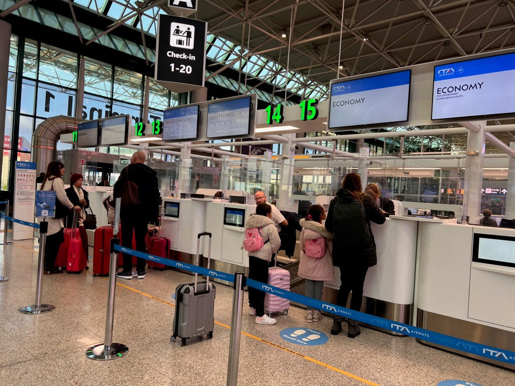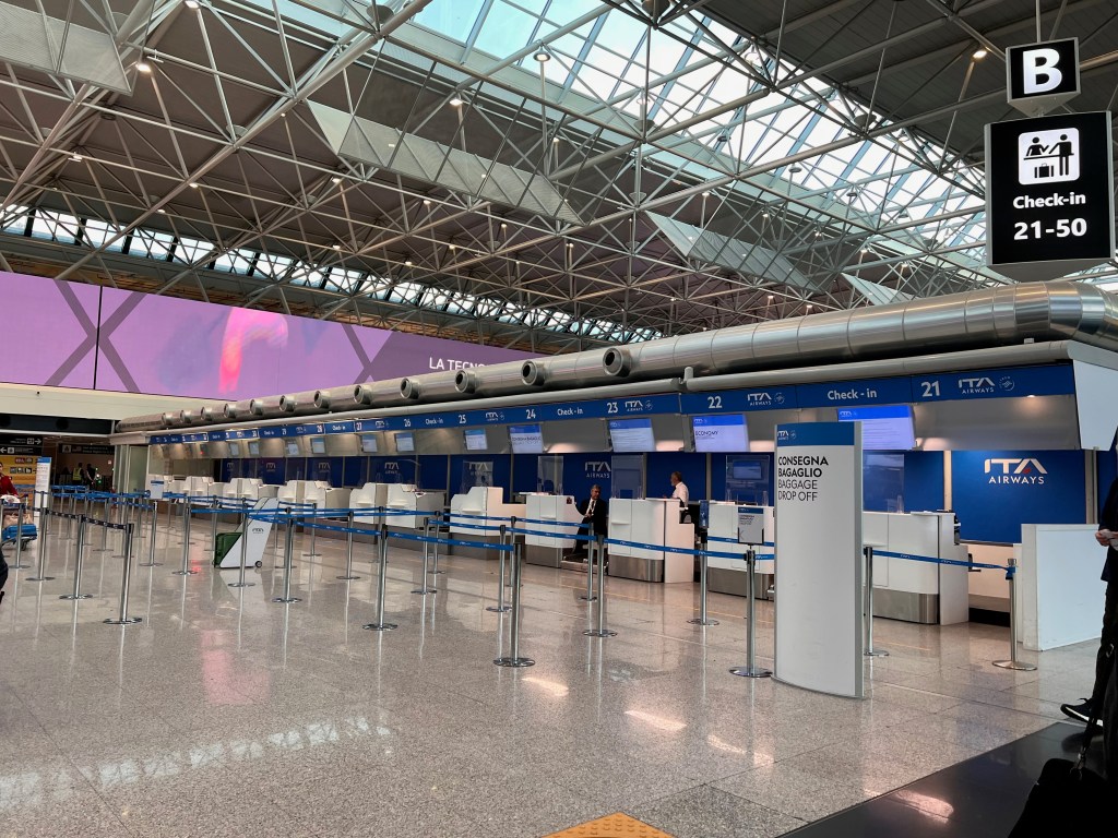ITA Airways, formerly known as Alitalia, is the national carrier of Italy. The troubled Alitalia was previously privatised, and due to financial issues, the Italian government bailed the airline out of its financial woes and rebranded it as ITA Airways. Therefore, finding some ITA Airways planes still donning the old Alitalia livery is unsurprising. ITA Airways check-in counters are located in the centre of Terminal 1 of Rome Fiumicino Airport. Two rows of check-in counters at Row B serve ITA Airways Economy Class passengers flying out of Rome domestically or internationally. Separate check-in counters in Row A serve passengers flying on ITA Airways Business Class and status passengers with the airlines. Due to the many counters available, there was no queue at the check-in counters. The check-in process was a breeze, with the staff processing our check-in efficiently. We were given directions on the security that we had to pass through and where our gate departed. The check-in counters for ITA Airways are very conveniently located next to the security clearance that gave us access to the airside of the airport terminal.