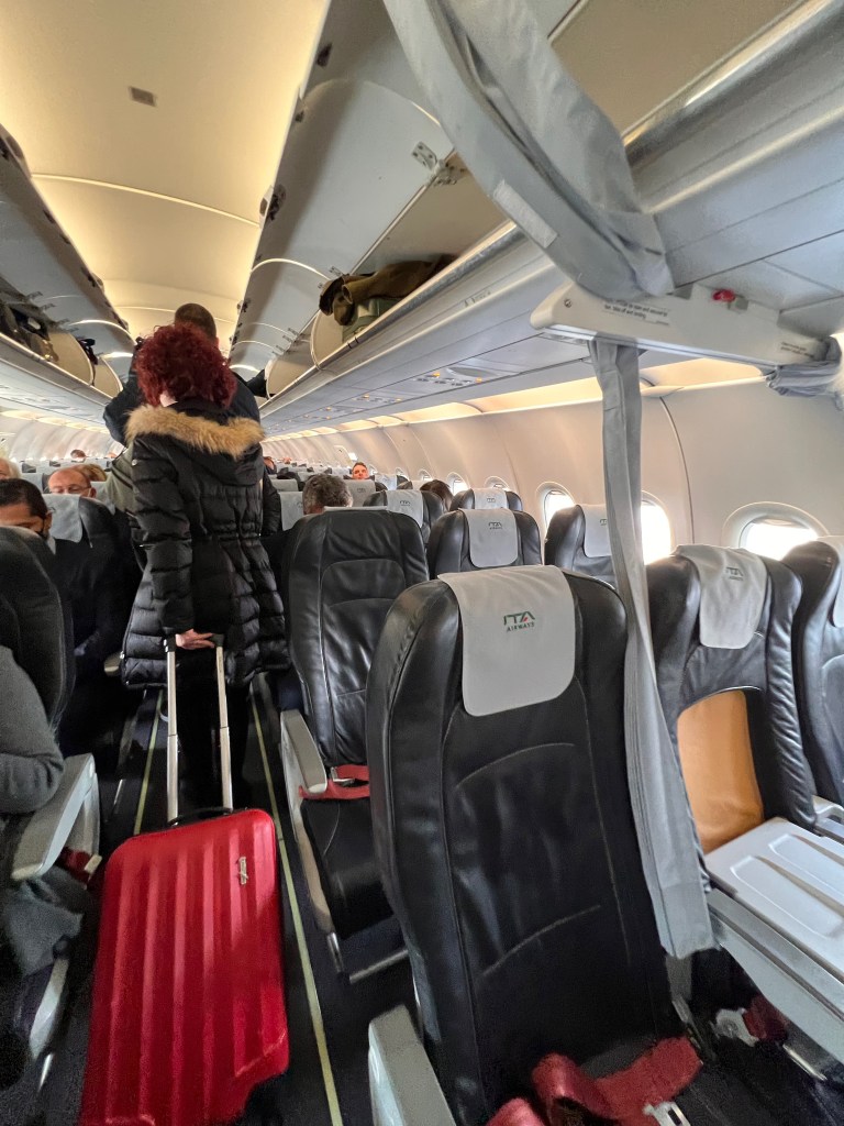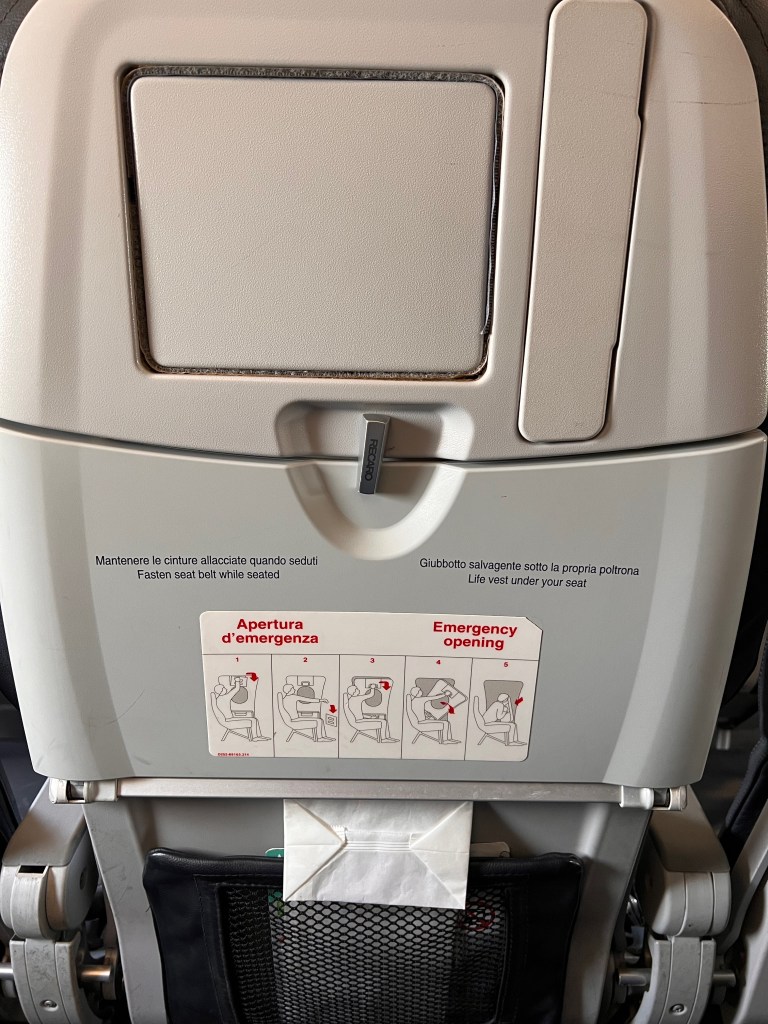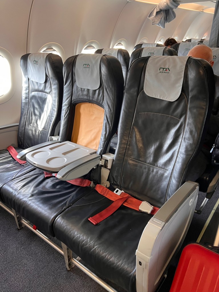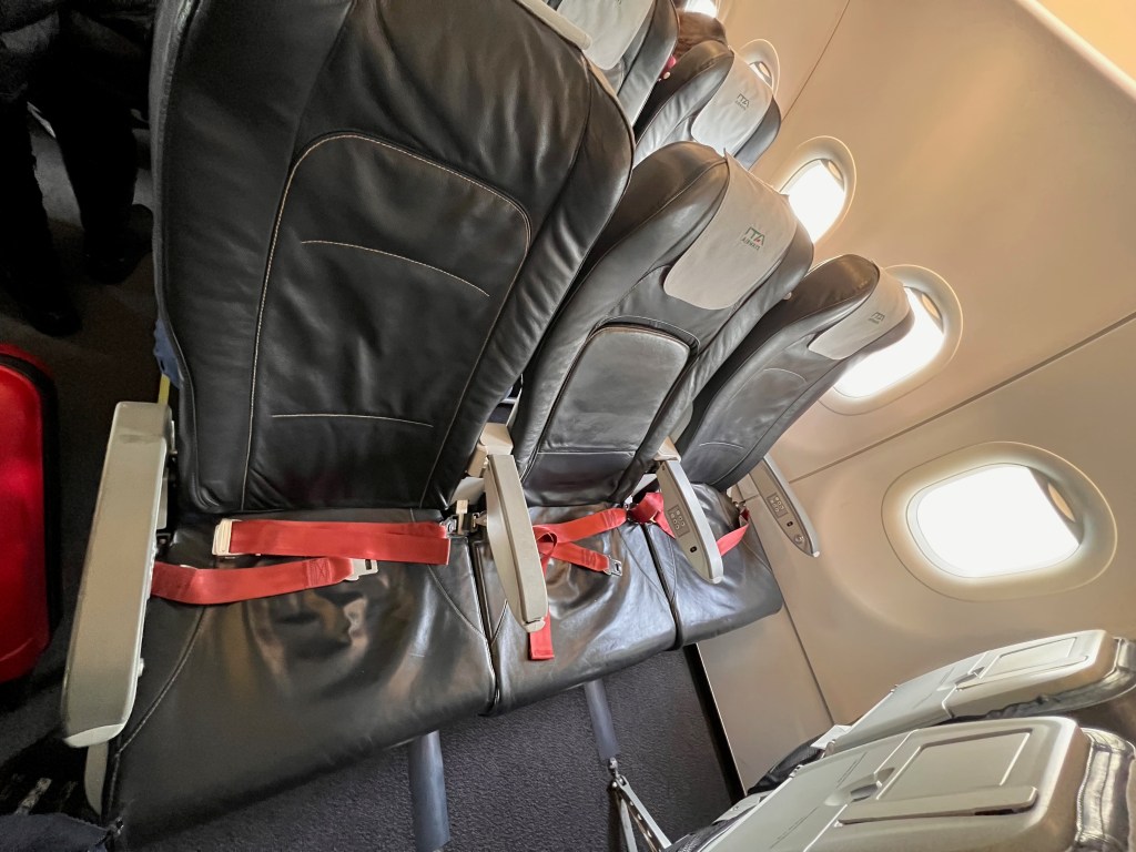 Seats on board ITA Airways A319-111 are the same regardless of the class of travel. The most immediate difference between the classes is that the seats in Business Class have a middle seat blocked out, sitting only two passengers in a row. All seats, both Business Class and Economy Class are 17.7″ wide. Business Class has a slightly longer seat pitch of 31″ compared to the 30″ in the standard Economy Class. We paid an additional €12 for the exit row seats, which gave us the longest pitch of 35″ (longer then Business Class seats).