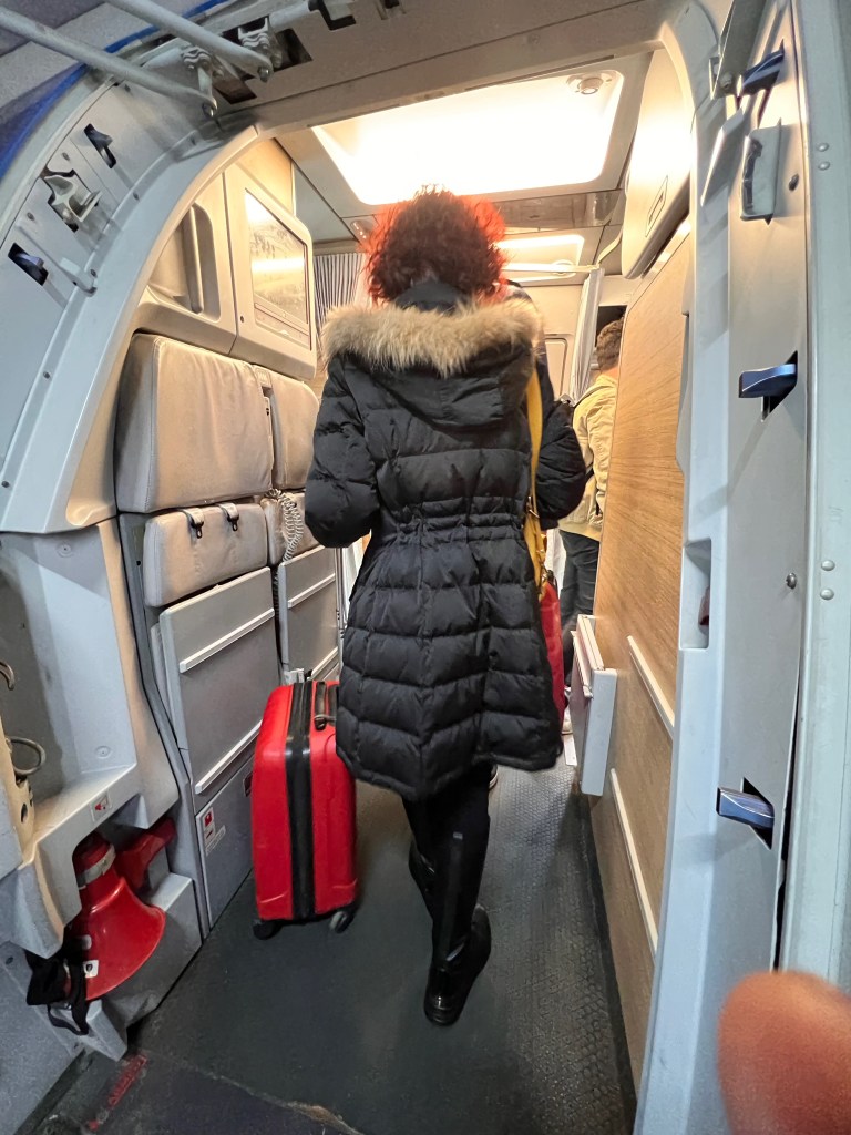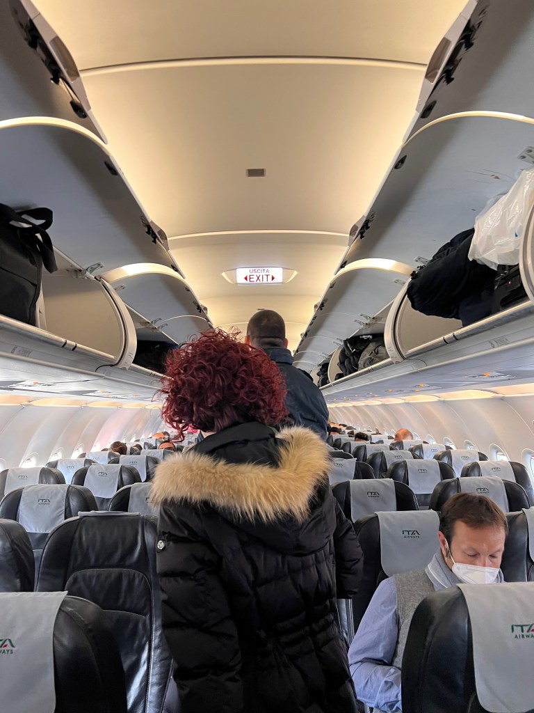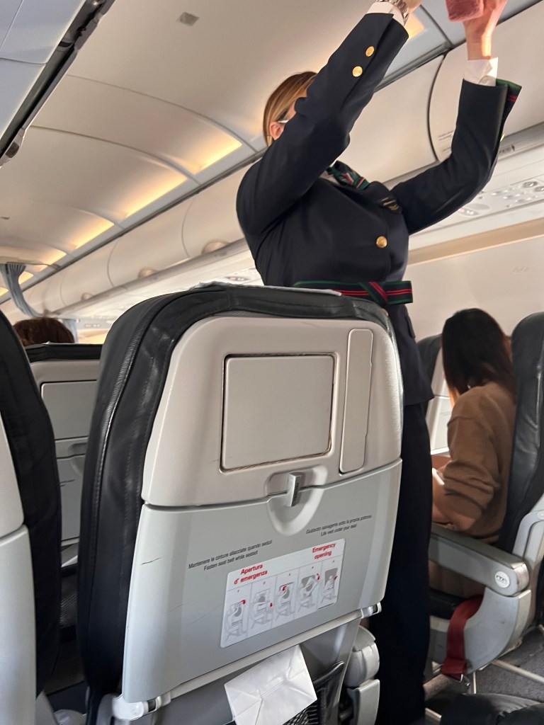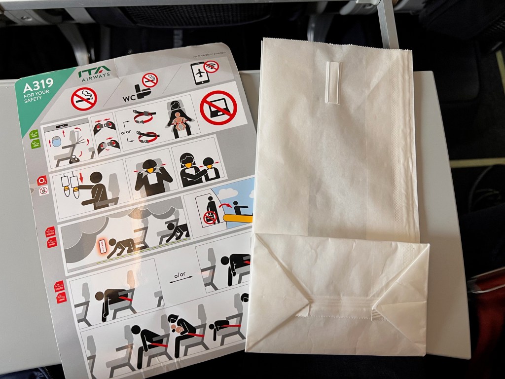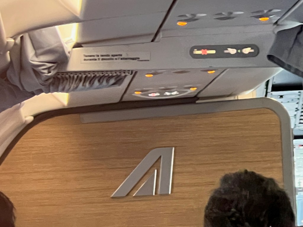 Seats on board ITA Airways A319-111 are the same regardless of the class of travel. The most immediate difference between the classes is that the seats in Business Class have a middle seat blocked out, sitting only two passengers in a row. All seats, both Business Class and Economy Class are 17.7″ wide. Business Class has a slightly longer seat pitch of 31″ compared to the 30″ in the standard Economy Class. We paid an additional €12 for the exit row seats, which gave us the longest pitch of 35″ (longer then Business Class seats).