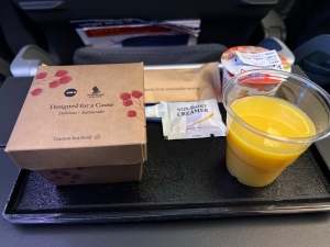We were given two options for breakfast today – Singapore Fried Carrot Cake with Prawns and Scrambled Eggs with Chicken Sausage. I chose the Fried Carrot Cake for breakfast. I am not a fan of the take-out box design used in regional Economy Class, as it made the portion feel small and was challenging to eat from. Singapore Airlines only served its Economy Class passengers a yoghurt. The bread roll that used to come with its Economy Class meal was not served on this flight. Singapore Airlines was generous with the prawns served with the fried carrot cake. The meal was delicious and full of flavours. My friend opted for the Scrambled Eggs and found the eggs to be a tad dry and the sausage bland.