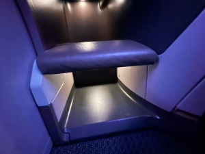 A large solid table is stowed under the IFE screen. With a push of a latch, the seat table pops out in its storage mode, which is half the size of the table. Passengers who do not need the large table can use it in its storage mode. The seat table folds out to its dining mode, which is twice the size of its storage mode. The seat table does not feel wobbly and is perfect for dining and working on a 16″ laptop. Under the IFE screen is a footwell, which is meant for passengers to stretch their feet into when the seat is deployed in its bed mode. Singapore Airlines fully used the space under the footwell by leaving it empty to double up as a space to stow carry-on or for passengers to place their shoes.