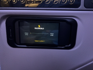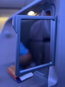 There is no lack of storage space on Singapore Airlines’ regional Business Class seats. There is a small cabinet at the side of each side for passengers to stow smaller items like mobile phones and passports. The small sliding door installed at the cabinet ensures the items inside remain secure and out of sight. Within the cabinet, passengers can find an international power socket and two USB charging outlets, making it very convenient for passengers to get juice for their devices. A hook next to the cabinet creates space for passengers to hang the headphones provided by Singapore Airlines when not in use. Singapore Airlines designed the space by the cabinet as a side table, which doubles up as a cocktail table, for passengers to place small items on. I thought the biggest flaw with the Singapore Airlines regional Business Class seats was the placement of the seat pocket. The seat pocket is placed at the lower corner of the seat on the back of the seat in front. Passengers wanting to access the seat pocket must unbuckle their seat belts and stretch for it. The seat pocket seems to be meant only for Singapore Airlines to place in-flight magazines and safety cards as it is too shallow (and tight) to fit in anything else.