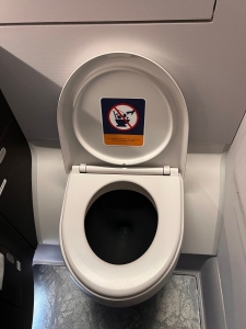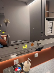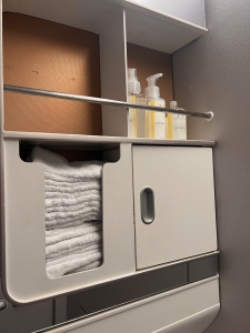 There are three lavatories, one located up front right behind the cockpit and another two between the two Business Class sections, serving all 40 passengers in Business Class. In terms of size, the Business Class lavatories on Singapore Airlines A350-900 are no different from that in Economy Class. However, Singapore Airlines differentiates its Business Class lavatories from Economy Class by fitting them with brown leather backsplashes on the bulkhead. The patterned flooring also gives the Business Class lavatories a more premium feel. Singapore Airlines is one of the few airlines that packs its lavatories with amenities for guests’ convenience, even in Economy Class. In Business Class, Singapore Airlines packs its lavatories with more amenities to differentiate it more than that from Economy Class.