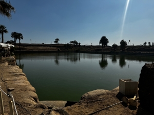 Our first stop is to head to the Sacred Lake. We were here for the cafe to get some drinks (not because we wanted to visit the lake). The Sacred Lake is a huge rectangular pool of water that seems man-made. This lake was significant as the priests would purify themselves daily before rituals. A large stone scarab sitting on a stone pillar was placed next to the Sacred Lake. Ahmed told us about the local urban legend that walking three times around the scarab will make one rich, five times bring one good luck, and seven times to bear children. I am sure there are other parts of Karnak Temple that we did not visit; however, those that Ahmed brought us through were the significant parts. We headed back to the hypostyle hall for more pictures before braving through the gauntlet of vendors at the exit to meet with the rest of the group.