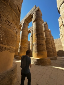 Passing through the second pylon, we arrived at the hypostyle hall, essentially a hall of pillars which would have supported the temple’s roof in its heyday. Unlike the one we saw at the Step Pyramids in Saqqara, the hypostyle hall here in Karnak Temple was on a much larger scale. Ahmed guided our sight to the top of the columns and explained that the colours we saw were original since the temple was built. We could see the vibrant colours adorning the top part of the pillars that survived the millenias as though they were painted yesterday. Each pillar has intricate carvings depicting scenes of religious ceremonies and rituals performed by the pharaohs, priests and gods. Ahmed shifted our attention to the grill-like stone structure at the top of these pillars and explained these grills were not randomly placed there but were designed by the builders to allow sunlight in to illuminate the hypostyle hall. I can imagine how dark it would be when this hall was covered with its thick stone roofs, these grills would provide sufficient illumination to the hall.