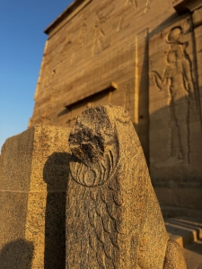Our first stop of the day was the Temple of Isis on Philae Island. The island can only be accessible via boat, which can be boarded past the ticketing counter on the mainland. However, the ticket price for the temple did not include the boat ride. Getting a boat ride to the temple requires huggling with one of the many boatmen at the ramp. The boat ride took around 10 minutes; we passed by Nubian houses painted in bright colours that reminded me of the houses in Burano in Venice we visited last year. The ancient Egyptians believe the Goddess Isis scattered this part of the Nile with cataracts that broke up the forces of the current, offering them protection. Hence, they also regarded Isis as the Goddess of Protection and built a temple here to worship her. From Philae Island’s landing point, the first thing that caught my attention was a tall pylon standing majestically with reliefs showing which Egyptian God was in charge at this temple. Amongst all the reliefs, the largest relief portrayed the king of Egypt slaying his enemies in the presence of Isis. On top of this were reliefs portraying the king making offerings to Osiris, Isis, Horus and Hathor. A couple of stone lions are standing guard by the entrance of the first pylon, welcoming guests to the Temple dedicated to Isis.