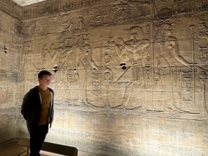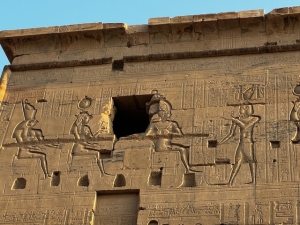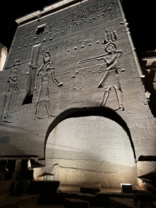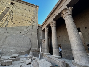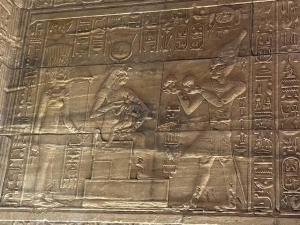 Passing through the first pylon brought us to a small courtyard, where the second pylon was immediately visible. Here, we saw the pharaoh making offerings to Osiris with Isis standing behind him and another relief depicting the king making offerings to Horus with Hathor standing behind him. Our tour director, Ahmed, brought our attention to a large stone sitting to the right of the entrance of the second pylon and told us this piece of rock served as a notice board in ancient times for the temple, which recorded the rules for entering the temple.