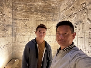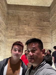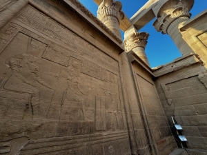 As we were walking towards the sanctuary, Ahmed focused our attention on an altar with a square hole cut into the wall. The cross on the altar and above the depression on the wall were signs that Christians once carved a space in the temple; after the temple was built, they occupied a corner of the temple to worship their God alongside the Egyptians. The two innermost rooms on either side of the sanctuary had murals depicting the king making offerings to Isis. The sanctuary room in the centre has a huge stone altar in the centre and was adorned with more murals of the king making offerings to the various gods on the side walls. There is even a relief showing Isis breastfeeding the king with her face chipped away. The centre wall of the sanctuary was filled with reliefs of the king making offerings to Isis. We walked around the interior of the Temple of Isis and found some spots that were not crowded to take pictures. We found an entrance that we thought allowed us to take some nice pictures of the temple’s interior.