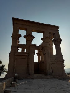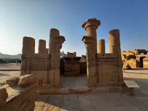 We exited the temple to take pictures of its exterior. There weren’t many engravings on the temple’s exterior (where we stood). The right side of the temple was scattered with ruins that seemed to be chambers or rooms for the priests. However, a lone structure caught our attention with its unique structure. The Kiosk of Trajan sits in what seems to be an isolated part of the temple grounds. The lower half of the Kiosk of Trajan was constructed with stones that had similar building techniques as the Temple of Hathor we saw a few days ago, and the top part of the kiosk had pillars supporting the beam. The top part of the Kiosk of Trajan reminded me of the Greek-styled Temple of Concordia that we visited in Sicily, Italy, last year, but with the Egyptian elements of open lotus buds typical of the pillars in a hypostyle hall. The Kiosk of Trajan was never unfinished during the temple’s heyday, which could be why we did not see any traces of the roof. The engravings on the kiosk, mainly on its interior, depicted the king making offerings to Hathor with Horus sitting behind her. One side of the Kiosk of Trajan afforded us a spectacular view of the Nile. This part of the Nile was very peaceful. We could see some of the small cataracts and lush greenery by the banks of the Nile. There weren’t any boats plying on this part of the Nile, a stunning view.