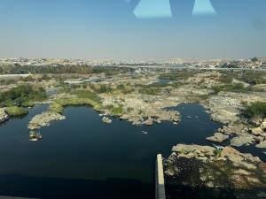 After the brief stops at the shops, we continued our journey and headed to our next sight – the Aswan High Dam. Life along the Nile was plagued with annual floods before the dam was built. The building of this dam not only controlled the flood but also provided the country with hydroelectric power. The building of the dam also controls the crocodiles that used to swim up and down the River Nile. Today, there are hardly any traces of crocodiles on the Nile north of the dam. Ahmed said the crocodiles are now kept in a crocodile sanctuary south of the dam. The drive to the dam was not that long, but we had to wait a while as the number of vehicles allowed there was controlled. There is only one spot where all the vehicles seem to be gathered for their visit to Aswan High Dam. This spot offered us the view of the Nile on one side and the view of Lake Nasser, where the river continues to flow to Kenya. Standing on the dam, looking down the Nile side, gave me the impression that this is where the Nile ends (but the river continues several thousand kilometres south). I saw barren lands on either side of the river bank that snakes its way towards the north of Egypt, with very sparse vegetation. On the southern side of the dam, the Lake Nasser side, the wide-bodied Nile looked more like a lake that stretched beyond the horizon.