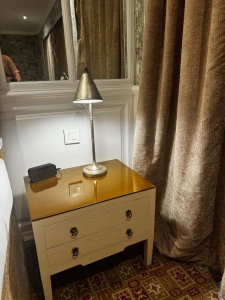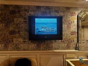 On the other side of the sleeping area sits the bedding area, which looks elegant. The brown high cushioned headboard matching the bed runners gave this part of the suite a very cosy feel. Rather than calling the bed a king bed, it is merely two super single-sized beds being pushed together to form a king bed. This bedding arrangement is very common in the cruise industry, where some cruise liners do a better job concealing the gaps of the single bed. However, on the MS River Tosca, there is no intention to conceal that the bed comprises two single beds. They even furnished the beds with individual blankets tucked into the space between them. The bed’s sleeping quality was excellent, leaving us feeling refreshed every morning and after every nap. At the end of the bed are a couple of individual benches, which we use to place our luggage. The top of these benches are padded with thick cushions, making them a great space to sit on while watching the TV mounted on the wall opposite. The TV placement is perfect for us to watch while lazing on the bed. However, the entertainment options on the TV are very limited, with only four channels: two Egyptian channels and one English channel. The fourth channel merely loops some PowerPoint slides over and over again. We were limited to the English channel, BBC, as we did not understand Arabic. Standing guard on both sides of the bed are two bedside tables. Decked in light brown, the two-tiered drawer bedside tables are quite large, giving us additional storage space and allowing us to place our lifestyle devices on them. The only design flaw with the bedside tables is the lack of power outlets, preventing us from charging our mobile phones.