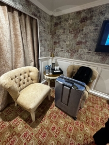 A couple of armchairs and a small table are tucked in one corner of the cabin, next to the floor-to-ceiling window panels. The thick cushion-padded armchairs are a great spot to relax, and the chairs are placed next to the window, which makes it a perfect spot to look out into the Nile as MS River Tosca makes its way along the river. The small table between the two armchairs is occupied by an electric kettle and coffee and tea items. We did not use the coffee and tea in the suite throughout our seven-day sailing onboard, as there was a pantry just outside our cabin. Nonetheless, it was thoughtful of the boat to provide such convenience to their guests by including a small coffee/tea station here.