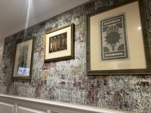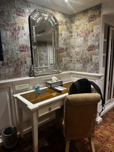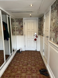 The entryway of the Grand Suite onboard MS River Tosca did not have any furnishings, and we could see the entirety of the Grand Suite from this part of the room. My first impression of the Grand Suite onboard was that it looked old school due to the colour choice of the wallpaper and the carpet. The grey background wallpaper with patches of maroon, brown print, and white laces looked like something from the 80s. The brown and red carpet in the suite gave it a desert vibe, seemingly reminding guests that Egypt is covered mostly by the Sahara desert. The entryway is home to the wardrobe in the Suite and the entrance to the bathroom.