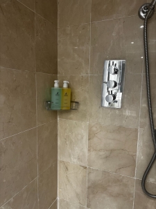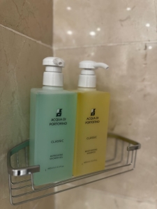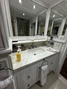 The wardrobe fitted in the Grand Suite onboard MS River Tosca has three sections. The section nearest the door is where we found additional pillows and a minifridge fully stocked with drinks complementary to guests onboard. The second panel of the large wardrobe is where we hang our clothing. The hanging space behind the second panel gave us ample space to hang our seven days’ clothing. I liked how the riverboat was generous in providing us with many hangers in the wardrobe. The third section of the wardrobe features shelving space with three large drawers occupying the lower part, while the open shelf takes the top part of this section. I also like the generous amount of space in this part of the wardrobe, allowing us to stow our smaller clothing items and stuff we bought out of sight. We found an in-room safe in this part of the wardrobe. The three-panel sliding doors on the wardrobe are fitted with mirrors, making the entryway look larger. Opposite the wardrobe is the bathroom.