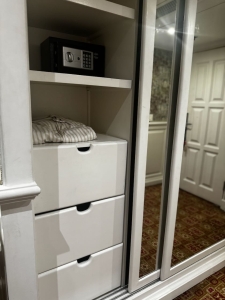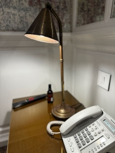 The sleeping area occupies most of the space in the Grand Suite. Next to the wardrobe is a vanity table that doubles as a work desk. The desk is large enough to serve both functions, and its three drawers provide additional space to stow away smaller items. We primarily used the power outlets fitted on the wall at the work desk to set up our “charging station,” where we charged our power banks and lifestyle devices.