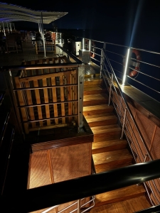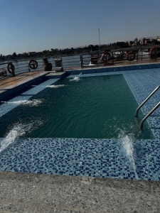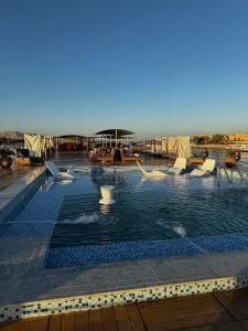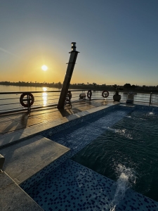 MS River Tosca dedicated the entire Sun Deck (Deck 4), the highest deck onboard, to the sundeck and swimming pool. The sundeck consists of two distinct areas: the pool deck and the alfresco area. The forward part of the boat is dedicated to the pool deck, where a small pool is fitted to the front of the sundeck onboard MS River Tosca. The pool is too small for anyone to swim in, which I thought served more as a dipping pool to cool guests off during the summer months. There are numerous sun chairs and loungers behind the pool for guests to relax while we sail on the Nile. The sundeck is a great place to watch sunrise and sunset. We enjoyed the tranquillity of the Nile on the sundeck loungers.