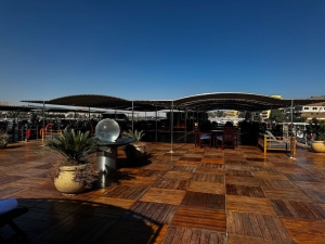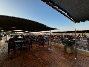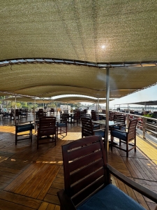 The back half of the sundeck is an alfresco area furnished with dining tables and chairs to cater to different group sizes. Guests using the alfresco area are shaded by a large tentage, which I found perfect for relaxing and enjoying the Nile breeze. A bar counter at the back of the boat serves drinks and cocktails. Daily afternoon tea onboard is also served at this part of the sundeck. Activities such as yoga, Zumba and cooking classes are also conducted in the alfresco area of the sundeck.
