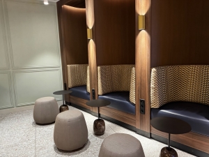 To the left of the entrance to the lounge, a bright area houses the first dining area. Behind this dining area is the outdoor terrace. Opposite the dining area is quieter, catering to passengers who want to catch some rest between flights, where single-seat armchairs with ottomans are fitted facing the tarmac. The high-partitioned tables, high-back chairs here, and the two workspace cubicles provide passengers privacy to do their work or engage in video conferencing. Pass the work area in the Star Alliance Lounge, tucked in one corner is the toilet and four shower rooms. To use the shower facilities, we are required to surrender our boarding pass in exchange for a key at the reception. The black marble walls and the shower room’s light brown sink counter area gave it a clean and chic look. Despite being a semi-open shower stall, I did not find water splashing out of the wet area of the shower room.