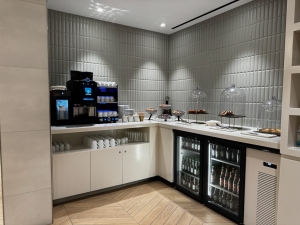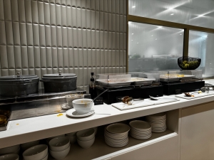 The main dining area is located to the right of the entrance to the lounge. Before hitting the main dining area, I passed a wine room stocked with wines displayed on the glass window to the semi-open bar. Passengers are welcome to taste the wine inside this bar. There is restaurant-style table seating that seats two pax per table next to the buffet area in the main dining area. Those in a larger group can opt to use the long table in the centre of the buffet area. For a lounge, I’d say the food selection is quite substantial. We were treated to 11 choices in the warm food area, which were topped up regularly. There is a separate salad bar in the cold food area where we found yoghurt and desserts. The Star Alliance Lounge also has a bread counter with a drinks station stocked with limited bread choices.