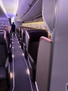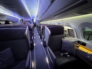 Singapore Airlines A350-900 has 253 seats, 42 in Business Class, 24 Premium Economy seats and 187 Economy cabins. The 42 seats in Business Class are further split into 26 seats in the forward Business Class cabin and another 16 in the smaller aft Business Class cabin. The ambience in the Business Class cabin felt cosy and calming. Singapore Airlines employs earthy tones in their Business Class seat and carpeting. The use of lilac-coloured lighting combined with soft, warm yellow lighting enhances the feel of calmness in the cabin.