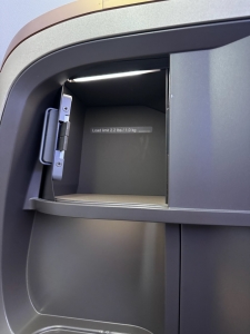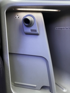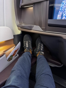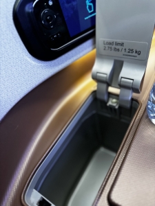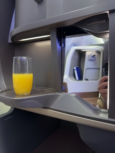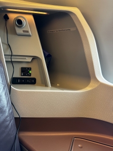 I like the generous storage space on the Singapore Airlines A350-900 long-haul Business Class seats. A small cabinet in front of the seat has a sliding door large enough for passengers to stow tablets. The sliding door prevents the items from falling off during take-off/landing and turbulence. There is another open shelf next to the seat for passengers to stow flat items for easy access. However, as this cubby was not fitted with a door, passengers are required to keep this cabinet empty during take-off/landing. On top of these, there is yet another cubby with a cover by the window that was fairly deep for passengers to stow small items. I use this cubby to stow my passport and phone when not charging. There is sufficient space under the footrest for passengers to place my carry-on.
