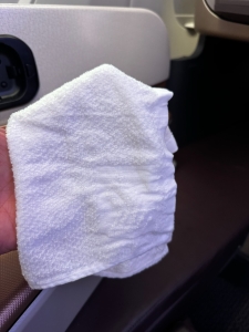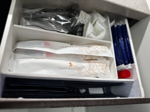 There are three lavatories in the Business Class cabin: one up front behind the cockpit and two between the two Business Class cabins. The lavatories were also decorated with an earthy tone of dark brown in the sink cabinets and sand colour in the walls. The Business Class lavatories onboard Singapore Airlines A350-900 feel classy and spacious with the combination of the colour theme and the abundance of mirrors. The lavatories are very well stocked with amenities such as dental and shaving kits in the drawers and Penhaligon’s eau de toilette, facial mists and hand lotion. Other than paper towels and soft tissues, Singapore Airlines also stocked its Business Class lavatories with cloth handkerchiefs, which is uncommon on other airlines.