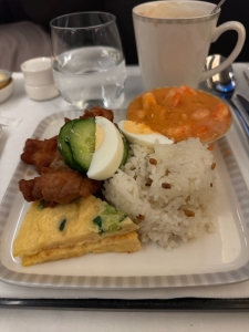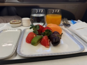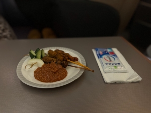 Breakfast service begins about 2 hours before landing. The breakfast service began with a fruit platter of grapes, tangerines, strawberries and honeydew. I only ate the honeydew, which was sweet and juicy. A cabin crew came by and offered a choice from the bread basket. I went for the croissant and au pain chocolate. The breads were tasty and fluffy. I used the book-the-cook service for the main course and opted for Nasi Uduk, a coconut-flavoured rice served with spicy sambal prawns, fried chicken and spring onion omelette. The Nasi Uduk was another disappointment; I could hardly taste any coconut flavour in the rice, which was soggy. The fried chicken was not crispy and tasted like it had been left in the fridge for days. The only saving grace was the prawns, but despite indicating as spicy, I did not taste any spiciness in the prawns.