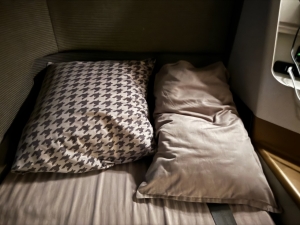 The seats onboard Singapore Airlines A350-900 are arranged in a 1-2-1 configuration. These controversial seats have a pitch of 60″ and measure 28″ wide. The seat onboard Singapore Airlines A350-900 is very comfortable, thanks to the generous width and the thick cushioning. They are one of the widest seats one can get in the sky. There are technically three modes the Singapore Airlines Business Class seats can be converted to, but the seat controls on the armrest are only programmed for the upright mode for take-off/landing and the lounge mode. The upright mode was supposed to be the most uncomfortable as it entails sitting up straight; however, the thick padding and the ultra-wide seats made up for the uncomfortable sitting position. The lounge mode is my favourite mode. In this mode, I was able to recline the seat to a position that allowed me to relax. Other than the preset position, the seat controls allowed me to adjust the angle of the recline and how much I wanted the calf rest to pop up. I find the lounge mode best when watching movies or dining. The third mode, the full flatbed mode, requires cabin crew to flip the seat. Passengers will sleep on the back of the seat while in this mode. The comfort level of sleep is very personal: while some had complained about how hard the back is, I find the firmness acceptable and comfortable (or maybe I was too tired). I was able to get a good 6 hours of sleep onboard. The other thing that passengers usually complain about is the Lazy-Z seat design. This requires passengers to sleep at a certain angle to fit their feet into the cubby hole. As a side sleeper, I was not too bothered by the sleeping angle. The big pillow placed on the seat waiting for passengers when we boarded the aircraft was comfortable to sleep in. In addition, when converted to bed mode, passengers are given a smaller firm pillow.