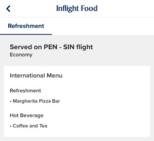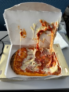 Due to the short flight time, there was only one option for this leg of the flight. We were served Four-Cheese pizza in a box during this leg. The thick-breaded pizza was served warm and tasted decent, sufficient to fill one’s stomach temporarily. Due to the short flight time, the pizza was distributed alongside the drink service.