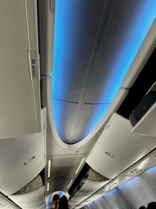 The Economy Class cabin on Singapore Airlines B737-800 NG looks bright and airy. The light colour of the seats brings some vibrancy to the cabin. Blue mood lighting during and throughout the flight complements the seat colour and lifts one’s mood while flying in the older aircraft.