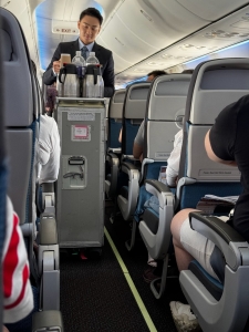 Despite the short flight time, service onboard this one-hour-plus flight was amazing. The cabin crew smiled and greeted passengers as we boarded the aircraft. They were seen helping passengers locate their seats. The short flight time did little to affect the quality service we received onboard. Despite the short flight time and immense pressure to distribute the snacks and complete meal service, the cabin crew was still seen smiling. The refreshment service did not come across as being rushed. The short flight time also allowed me to observe a great deal of teamwork portrayed by the cabin crew. The cabin crew were observed working as a team to complement each other and ensure the snack was distributed to all passengers in good time.