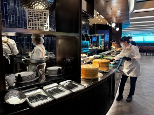 The main buffet and dining area are located on the left of the entrance to SilverKris Lounge, employing the same calming, earthy tone. The lounge was not too crowded during our visit, so we had no problems finding tables. Besides the a la minute noodle bar, food is mainly served buffet style. The food served was mainly local cuisines, on top of some finger food. There is also a salad bar placed in the fridge next to the main buffet counter. Here, we also found fruits and some packaged sandwiches. Drinks are available in fridges located throughout the lounge. We also found coffee and tea stations dotted across the entire lounge. There are some shower facilities next to the toilet near the main buffet area. We did not use the shower facility (we subsequently tried to use the shower facility in the evening and were told the queue time is up to 2 hours).