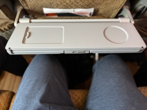 As with most Economy Class seats, passengers travelling on Singapore Airlines A350-900 Long Haul Economy Class are limited to the seat pocket in front as the only storage space. Despite having a small storage space, the seat pocket was sizeable enough to hold a tablet, mobile phone, and passports. I like the multiple-layered design of the seat pocket, which allows me to stow smaller items in the shallower front pocket while leaving the larger and deeper back pocket for bigger items. The design also allowed me to organise the stuff I wanted to stow for easier access. The tray table fitted on Singapore Airlines A350-900 Economy Class seats was also sizeable. The bi-fold tray table allows passengers to deploy only half the tray table, making moving in and out of the seat easy. When folded, there is sufficient space for us to place a cup of drink and smaller items. Singapore Airlines even fitted a small vanity mirror on the tray table. When fully deployed, the tray table allows passengers to work on their 15″ laptop when not using it during meal times.