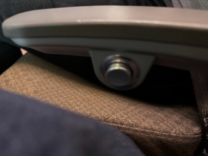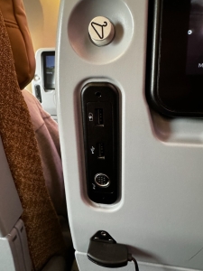 Economy Class seats onboard Singapore Airlines A350-900 Long Haul variant are arranged in a 3-3-3 configuration. These seats have a pitch of 32″ and measure 18″ wide, and they can generously recline to 6″ via the recline button found on the seat armrest. I found the padding on these seats fairly thick, which makes travelling on them even for longer periods comfortable. In terms of powering up our lifestyle devices, these Economy Class seats are fitted with two USB-A outlets on the seat back in front and a universal power outlet underneath them. However, only one of these USB-A outlets has a charging logo; I am unsure if it meant this is the only USB-A configured to charge. I also found an iPod outlet under the two USB-A outlets. The one thing I liked about these Economy Class seats is the inclusion of a cup holder next to the personal TV, giving passengers an alternate place to hold their cups without the need to deploy the tray table. There is a small groove at the cup holder, which I have yet to figure out its purpose as it is too small to place my mobile phone. Singapore Airlines also fitted a small coat hook above the USB-A outlets, allowing passengers to hang their shopping bags other than their coats.