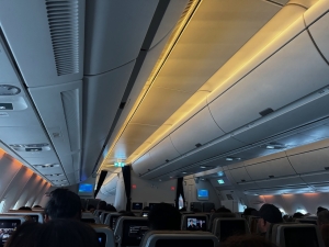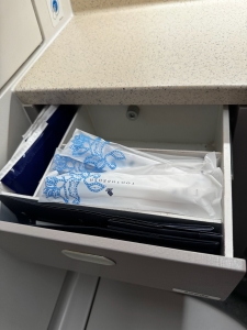 The lavatories onboard the Singapore Airlines A350-900 Long Haul variant are fairly sizeable, with sufficient room for passengers to use without knocking onto the bulkheads of the lavatory. The clever use of mirrors in the Economy Class lavatory enhances the sense of spaciousness. The dark brown wooden panelling used on the cabinetry at the sink gave the lavatory a luxurious vibe. Singapore Airlines is one of the few airlines (that I have flown) that provides amenities in their Economy Class lavatories. Besides the standard hand soap and tissue found in most airlines, Singapore Airlines also provides dental kits, shavers, and sanitary napkins in its lavatory.