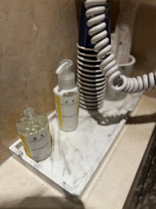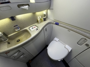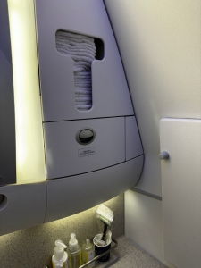Two lavatories at the front of the aircraft serve the 36 passengers travelling in Business Class. The Business Class lavatories predominantly use white colour in the fittings and the lighting to make them feel larger than they are. Unlike the other aircraft configurations, where the backsplash was decorated with a brown leather backsplash to give it a more premium look, the lavatories on Singapore Airlines B787-10 looked exactly the same as the ones in Economy Class. The only difference is the type of amenities offered in the Business Class cabin lavatories. Besides the more premium dental kits and shavers, Singapore Airlines also provided Penhaglion’s amenities in the Business Class lavatory.