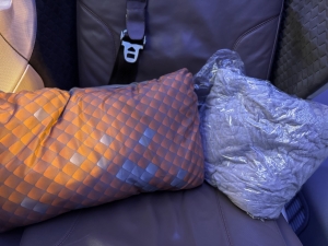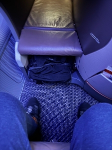 Regarding storage, Singapore Airlines regional Business Class seats on their B787-10 are fitted with a cabinet next to the seat with a sliding door that allows passengers to stow their smaller items even when the aircraft is taking off or landing. I find the space afforded for storage in this cabinet is on the smaller side. However, the cabinet is large enough to swallow a tablet on top of smaller items like passports and chargers. The side table, which also doubles as a cocktail table, by the cabinet also allowed me to place items on for easier access during the flight. However, these items must be put away during take-off and landing. Other than the cabinet, the seat pocket near the floor also provides some form of storage, but its inconvenient location discouraged me from using it as I had to bend over or get out of our seats to reach it. There is space underneath the footwell that provides us with an alternate place to stow our backpack other than the overhead bin. I mainly used this space to place the blanket provided during the initial hours of the flight.