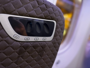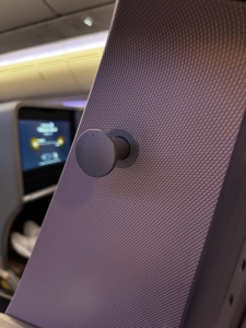 Singapore Airlines fitted its B787-10 with its regional Business Class seats, narrower than its long-haul Business Class product and even its B737-8 Max aircraft. Each Business Class seat onboard has a pitch of 60″ and measures 20″ wide (compared to the long haul seats, which are 28″ wide, and B737-8 Max, which are 21″ wide). Nonetheless, the thick padding and the luxurious leather on these seats made them comfortable for our flight to Narita. There are three modes configured into these seats: the upright mode for take-off/landing, the fully reclined 180° flatbed mode for sleeping, and the in-between lounging mode for greater comfort when watching movies. These seat modes can be activated through the touchscreen panel fitted on the aisle side of the seats. Other than controlling the angle of the seat, the seat control panel also comes with a lighting control and an attendant call button. I thought the seat control buttons were very well designed, and they are sensitive enough to activate and not too overly sensitive for accidental activation. The Singapore Airlines regional Business Class seats are designed with high shellback, improving passengers’ privacy, especially in flatbed mode.