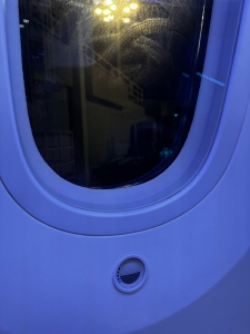 The in-seat table is stowed under the personal TV. The table was folded in half when I first fished it out of its storage space. The half-folded design meant I did not need to deploy the entire table size to only use it to place my drinks. When fully deployed, the table is large enough for passengers to work on their 15″ laptop. The table was not designed with a swivel function, and with the little space available for wriggling when it is fully deployed, the table will need to be stowed away whenever I need to move out of my seat. Other than the overhead lighting, Singapore Airlines B787-10 Business Class seats are also fitted with a panel of three reading lights placed high inside the seat, which are angled to provide illumination at various seating positions. Each Business Class seat has a universal power outlet and two USB-A outlets inside the cabinet, allowing us to keep our lifestyle devices and laptops juiced up throughout the flight.