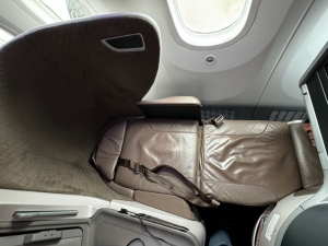 Singapore Airlines is very consistent in the tone and the vibe of its Business Class cabins across the various aircraft types and configurations in which it operates. Business Class cabins in their B787-10 employ different shades of brown to emphasise their earthy and relaxing vibe, apparent in the leather chosen for the seats, the shell of the seat and even the carpeting. The use of lilac mood lighting in Singapore Airlines B787-10 Business Class cabin made passengers feel relaxed, consistent with the vibe created by the earthy-coloured tone. Singapore Airlines B787-10 has only one Business Class cabin housing 36 seats arranged in a staggered 1-2-1 configuration.