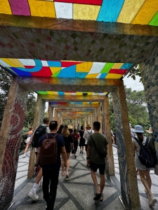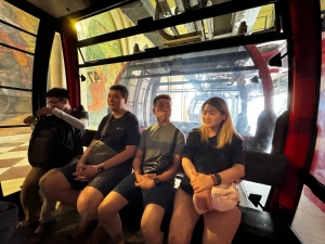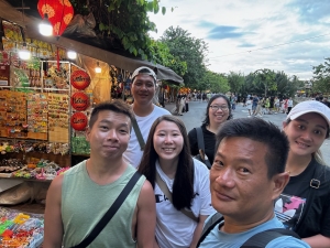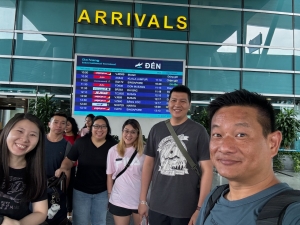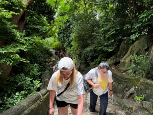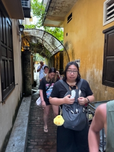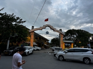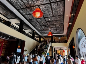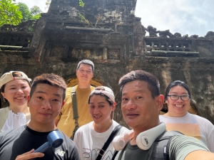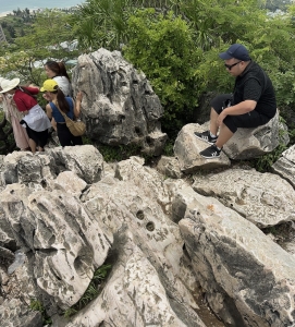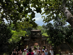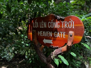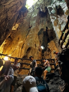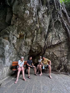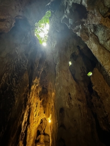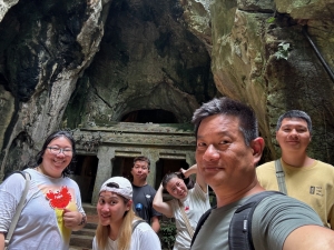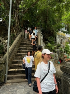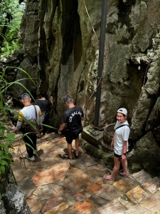 After our short rest, we followed the pathway to our next stop, Huyen Khong Cave, the largest cave in the Water Mountain. The entrance to Huyen Khong Cave is decorated with a well-carved stone archway., which led us to the cave entrance after a short walk. Huyen Khong Cave looked different from the other caves we have seen. Apart from its significantly large size, the flooring in Huyen Khong Cave was decked in deliberately polished marble, creating a flat surface. Sitting high on the cave walls was a Buddha statue in a meditation posture, blessing visitors who made it to this cave. Due to its sheer size, Huyen Khong Cave felt rather empty, with a couple of smaller shrines on both sides of the Buddha. The natural hole on the cave roof lets in rays of sunlight, giving it a mystical vibe. Despite its large size, there is not much going on inside this cave. Looking at the time, we realised we had spent almost 2 hours on Water Mountain. As we were a little behind time, we followed our guide’s instructions and made it to the staircase that marked Gate 1 to meet our guide at the base of the hill.