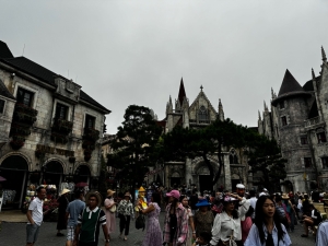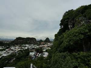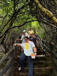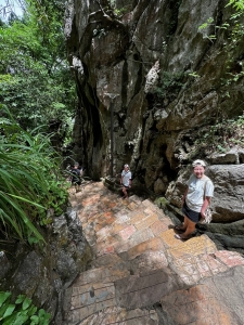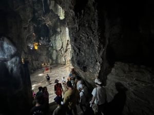 As Tang Chon Cave sits at the dead end, we traced our steps back to Ling Ung Pagoda and took the other path from the crossroad. Along the way, we saw another large cave that seemed to be packed with visitors. Thinking that we would pass by this cave again on our way back, we continued our walk on the path with a sign that said “Heaven Gate”. Thinking that this sign would lead us to the highest peak on Water Mountain, we followed the path this sign pointed to. The initial climb to the Heaven Gate was easy as it was well-paved with stairs that seemed to go on forever. Suddenly, we were met with a rugged natural staircase that seemed to suggest work on the staircase had stopped. Climbing up this set of rugged natural stairways was a tad more challenging. We had to negotiate with people coming down from the top while trying to find balance on whatever flat surface we could step on. Some of the steps were waist height tall, which would be torturous for people with knee issues. Fortunately, these rugged steps were only a short flight. Soon, we find ourselves on the top of the steps. We were treated to more unobstructed views of the sea and parts of the nearby peaks that form the Marble Mountains. The area at the top was rather small, and we had to balance finding whatever flat surface could accommodate our feet while negotiating with the crowd gathering at this small viewing spot. As people were coming up, we made our way down after taking some pictures. Back from where we came from, we took a short rest at a large resting area in the middle of the Water Mountain before continuing our walk to the last cave.