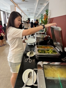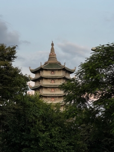 Our last stop in Linh Ung Pagoda was Reclining Buddha, a stone’s throw away from the Main Temple. The 48m long marble Reclining Buddha, though smaller than the Lady Buddha statue, was still impressive. The stone masons capture the peaceful expression of the Buddha as he enters his final resting position after achieving enlightenment. Standing behind the Reclining Buddha is the 9-storey olive-coloured Xa Loi Pagoda. As it was approaching closing time, we only visited the ground floor of the pagoda to pray to yet another Laughing Buddha inside the ground floor of the Pagoda.