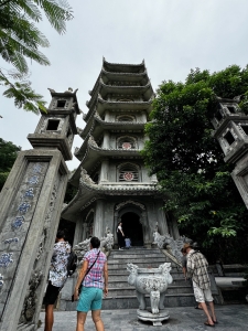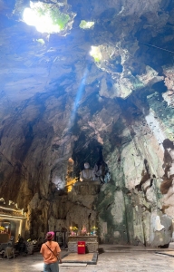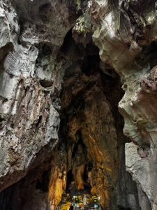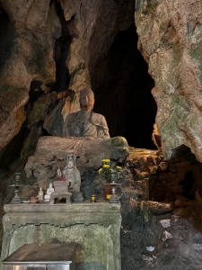 We met our guide at the main entrance of our resort, who brought us to the Marble Mountains, about a 15-minute drive from our resort. Having passed the Marble Mountains several times over the last few days, we are finally visiting this iconic sight of Da Nang. The Marble Mountains is a group of five marble and limestone hills, each representing an element of Water, Fire, Earth, Wood and Metal. Standing 105m tall, the Water Mountain is the biggest and the most beautiful. We started our Water Mountain from the eastern side of the hill, where an elevator system sits, saving us the climb of 150 steps. We exited the elevator at the top, followed the well-paved pathway and arrived at our first stop – Xa Loi Tower. Xa Loi Tower is a seven-storey stone pagoda visible from the base of the hill. The pagoda has a small surface area, and despite having 200 stone statues in the pagoda, we only saw one statue of Buddha installed in it. There was little to see at the Xa Loi Tower.