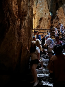 Tracing back from where we came from, we saw a sign that pointed to Tang Chon Cave. The cave is situated on top of a series of staircases. Tang Chon Cave is one of the smaller caves at the top of the Water Mountain. The path that we followed led us to the cave entrance that seems to have collapsed over the years. There is one flight of stairs inside the cave that leads us to the innermost part of the cave. This staircase creates a bottleneck where everyone congregates, with people going up and coming out from the inner cave. Despite not being a large cave, we spent most of our time here waiting for our turn to use the staircase. There are two Buddha statues inside the cave: a statue of a Buddha, sitting cross-legged with his eye closed in a meditation stance placed in one corner of the cave, and another statue of a standing Buddha at the other corner.