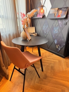 The living room is where we first saw tributes to the Capital of Music dotted in the ornaments around the suite. From the entrance, the bright red high-back armchair in the living room corner immediately caught our eyes. Despite the weird location (the chair is positioned to face the rest of the living room), I thought this chair was a great place for us to place our backpacks and to sit while looking out of the window at the street scenes of Vienna. I thought the decor of the suite looked beautiful. The charcoal colour walls painted with blue flowers and the diamond-shaped mirrors sparsely occupying parts of the wall were tastefully done. The floral theme is not limited to the mural on the wall, we also spotted flowers on the coffee table, the work desk and the small table at the far end of the living room. The living room is also furnished with a light grey armchair, large enough to sit three comfortably, and can be converted into a sofa bed to house another two guests in the suite. Between the red chair and the sofa are two coffee tables, one larger than the other. Other than a vase of flowers on this coffee table, the hotel also placed a bottle of wine in a saxophone-shaped wine holder, paying tribute to the musical theme in the suite. A large flat screen TV is mounted onto the wall inside a metallic ring opposite the sofa. Despite the many channels on TV, only a handful are in English, limiting the entertainment we can enjoy.