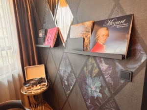 A work desk is placed behind the sofa. Topped with a black marble top, the spacious work desk gave us lots of space to do our work on. Besides the electric kettle, Hotel Am Konzerthaus Vienna also equipped the Masestro Suite with a small Nespresso machine. I like the musical note teaspoons at the mini bar, yet another way the hotel reminds us that Vienna is the capital of music. A mini fridge with complementary drinks and snacks is hidden in the cabinet beneath the work desk. Behind the work desk is a small round table accompanied by two chairs. We used this dining table as an alternate place to stow our smaller items. It is interesting to find a functional vinyl player placed on top of a small table sitting in this corner of the living room of the Maestro Suite. Hotel Am Konzerthaus Vienna placed some vinyl records on the two racks mounted on the wall beside the vinyl player. These additional classical music records are playable, besides being ornaments.