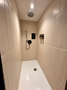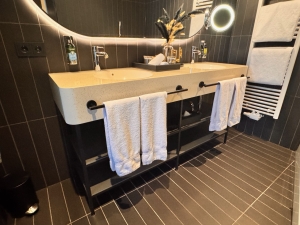 The Maestro Suite at Hotel Am Konzerthaus Vienna has a huge, well-designed bathroom. Using black tiles for most of the bathroom gives a classy and luxurious feel. A black door that leads into the toilet cubicle is sitting immediately after the entrance to the bathroom. Despite housing only a toilet bowl, I thought the cubicle was sizeable. Another glass door to the right of the toilet leads to the walk-in shower. Hotel Am Konzerthaus Vienna also allocated a good amount of space in this walk-in shower, fitted with a rain and hand-held shower head. There is a ledge carved into the wall at the walk-in shower that gave us space to stow our facial washes and dental kits. The water pressure from the shower heads is good, and the hot water heats up pretty fast.