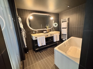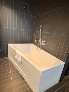 A relatively large area to the left of the toilet is occupied by the sink area, where the hotel fitted his and her sink with a generous amount of countertop space. Bathroom amenities are placed in the centre of the two sinks. However, dental kits and shavers are not provided by default. I am not too sure if they will be available upon request. The other weird thing I found in the bathroom is that only the right sink is equipped with hand soap, while the left sink only has body lotion. Despite predominantly using black in the bathroom, I found the sink area very well-lit. A large bathtub sits opposite the sink, by the wall with the toilet. The bathtub is perfect for soaking away the fatigue from exploring Vienna.